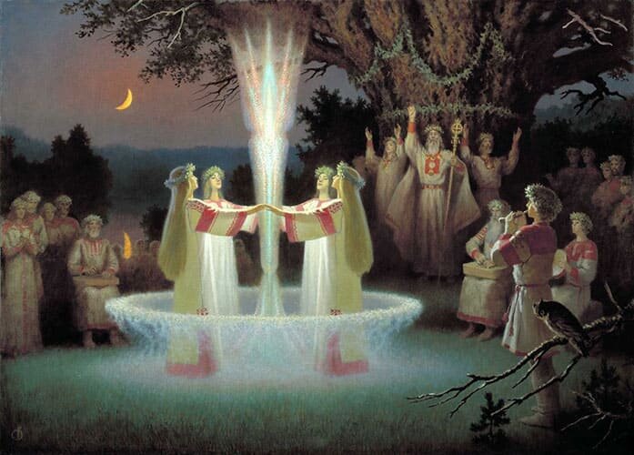 В этом смысле можно сказать, что славянский божественный пантеон — это мир дуализма, цикличной смены и перетекания друг в друга двух противоположностей: День и Ночь, Лето и Зима, Солнце и Звезды, Пробуждение и Сон, Возрождение и Смерть, а в конечном итоге — речь всего о двух великих энергиях жизни: активной проявленной и пассивной скрытой. И это самое важное, что нужно понять — славянские боги это НЕ мужички сидящие на облаке, где один «повелевает» ветрами, другой — зайцами, третий — стоячими болотами, а четвёртый — игольными ушками… это энергии или силы, которые наши предки умели различать в каждом явлении — от прихода весны или прилета птиц, до жизненных ритмов каждого конкретного человека.