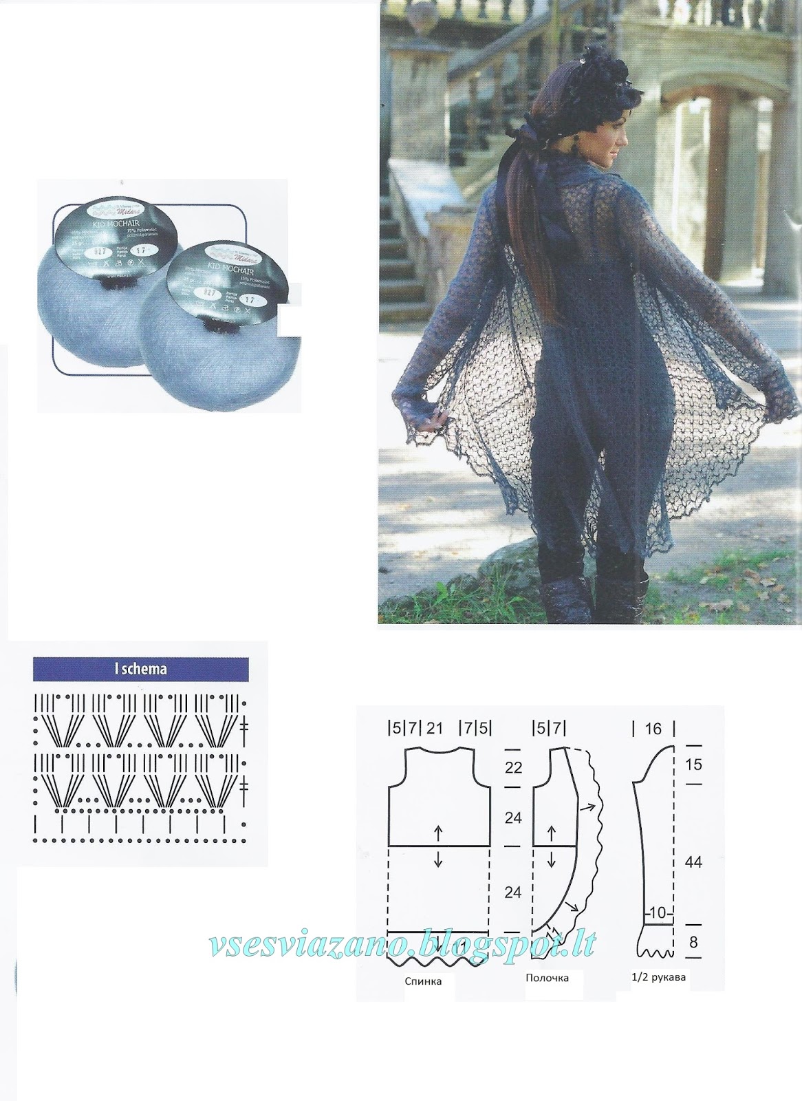 Детали летнего жакета вяжутся отдельными частями, на выкройке это показано стрелками. Сначала свяжите верх спинки, потом- верхние части полочек. При вязании ориентируйтесь на выкройку, которую, при необходимости, откорректируйте. Связанные детали верха жакета сшейте и вяжите вниз уже общей деталью длиной приблизительно 34 см ( с закруглением на полочках). После этого по краям полочек, низа и ворота вяжется отделочный волан длиной 11 см.