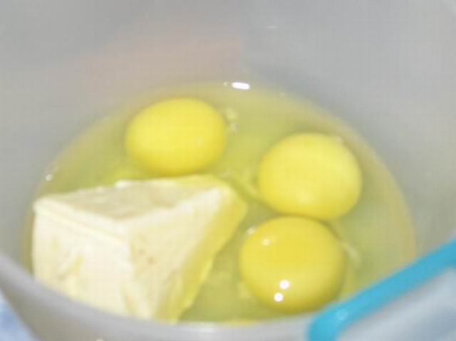Потом начинаем готовить тесто. Все яйца сразу соединяем с очень мягким или растопленным сливочным маслом. Его у нас как раз осталось 100 гр.