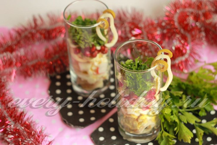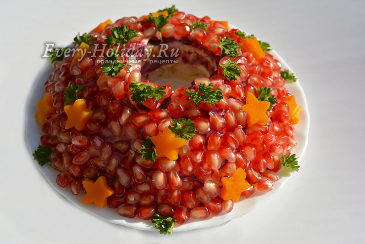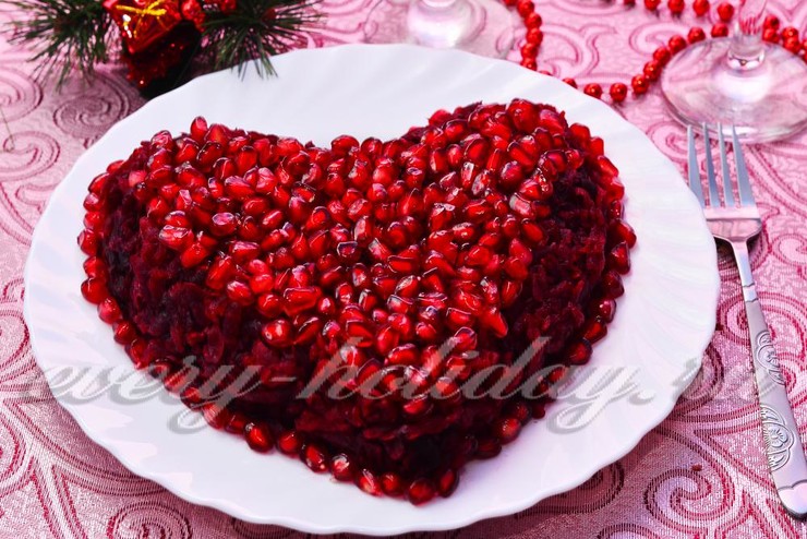 Салат «Гранатовый браслет» всегда делает стол более праздничным. Оформляется он гранатовыми зернами, кстати, именно они и придают готовому салату неповторимый вкус.