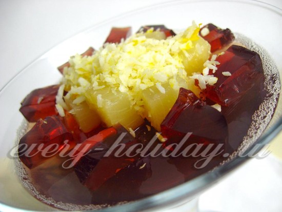 Двойное желе из фруктового сока с кокосовой стружкой и ананасами – вкусный холодный десерт, который легко сможет приготовить абсолютно любая хозяйка.