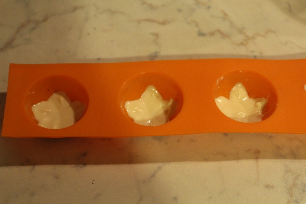 Теперь делаем мраморные конфеты. Белый и темный шоколад по очереди наносим на стенки формы. Теперь формы нужно слегка наклонять и крутить, чтобы шоколад немного перемешался и равномерно распределился по стенкам. Можно перемешать при помощи деревянной шпажки. Охладить 10 минут в морозильной камере.