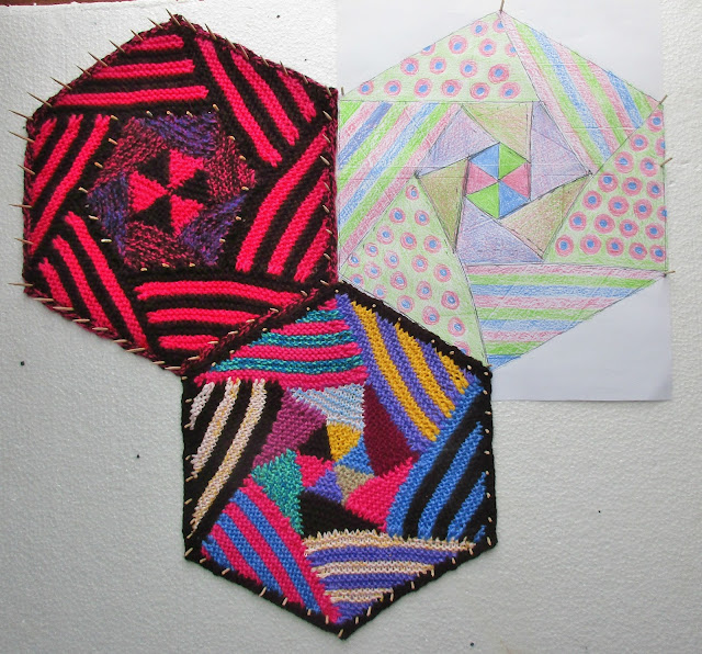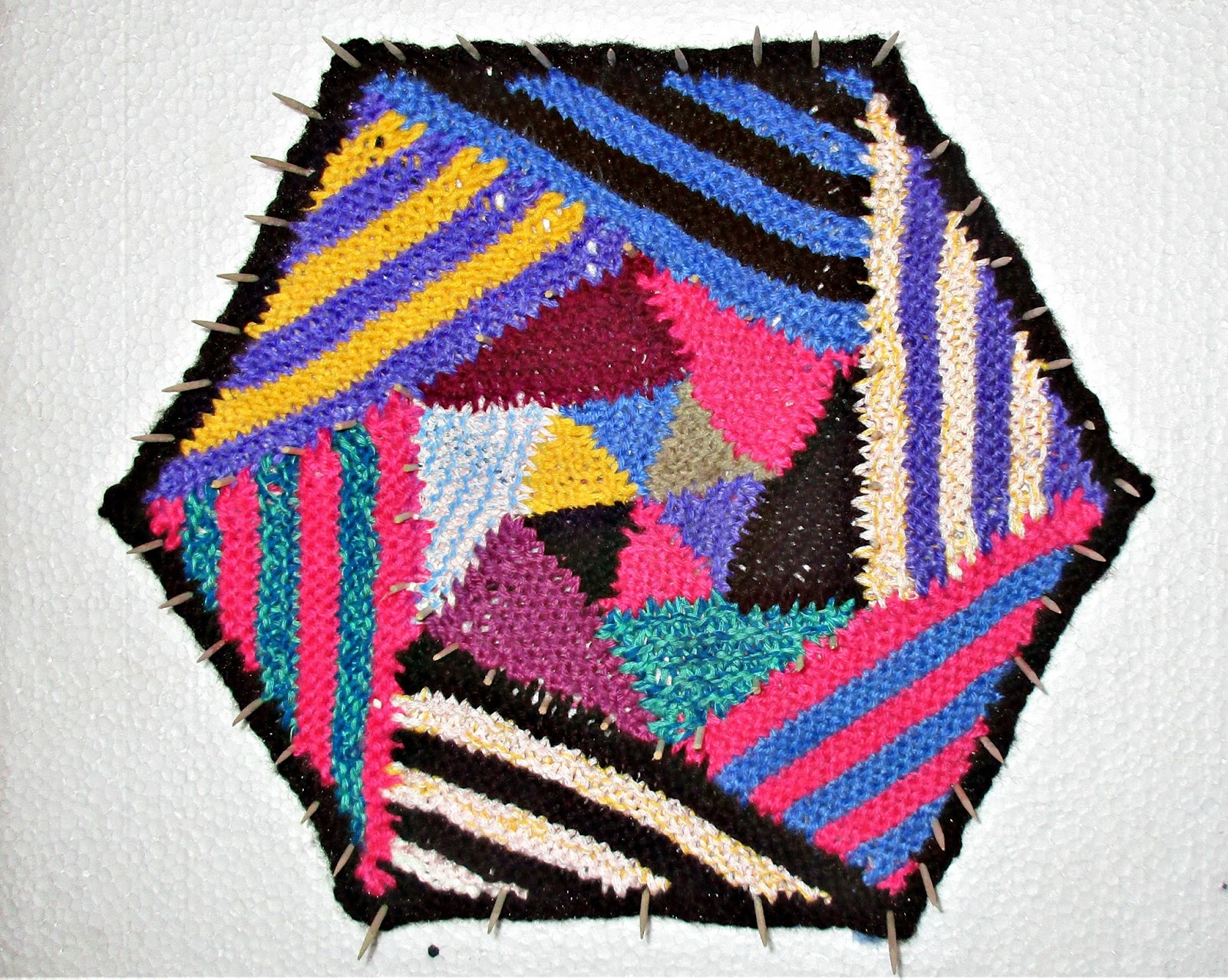 Этот шестигранник вяжется из маленьких остатков пряжи, на мой взгляд, слишком уж шокирующе ярки и бросско получилось. Хотя я люблю яркое.