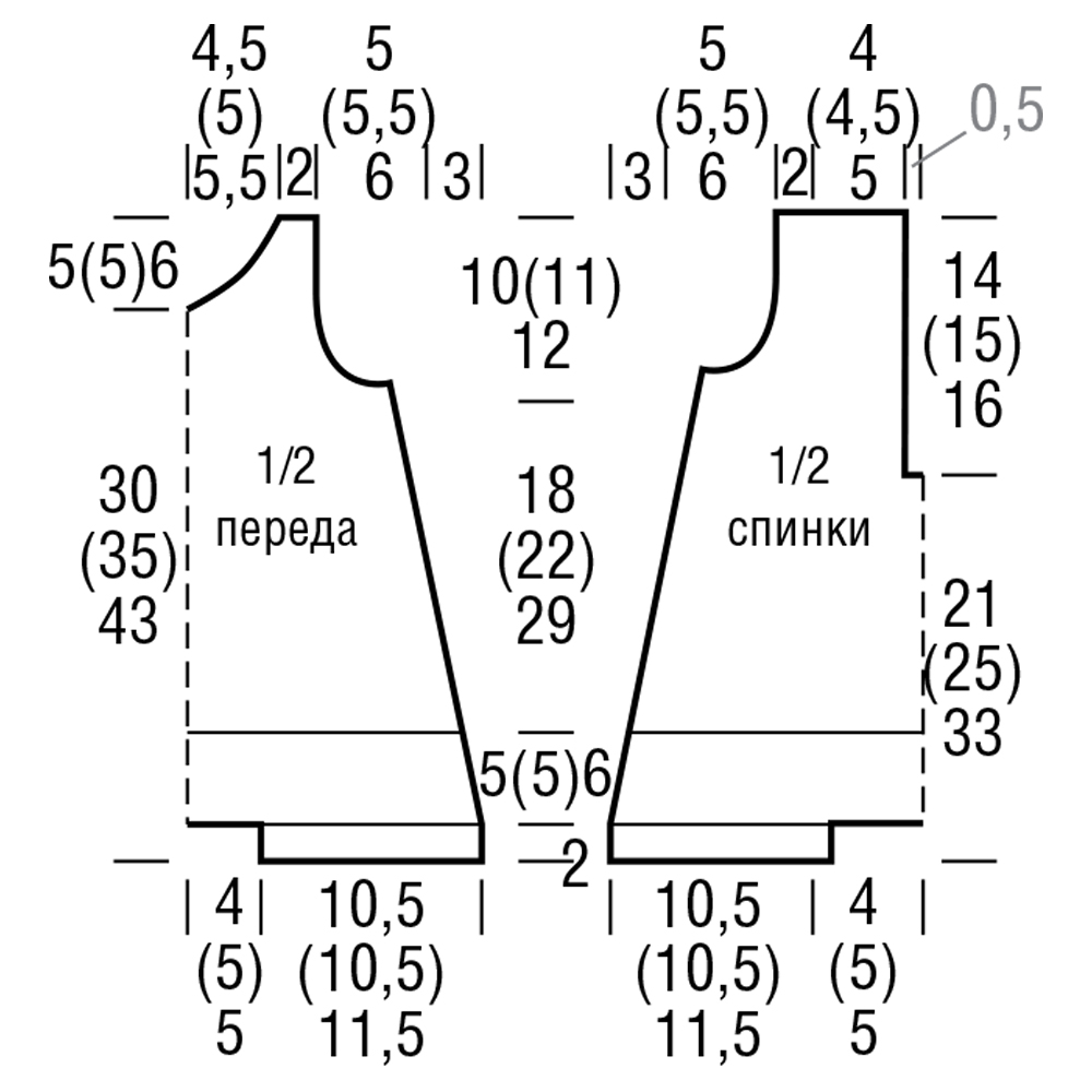 Для закругления горловины по внутреннему краю в каждом 2—м р. закрыть 1 раз 3 п., 1 раз 2 п. и 3 раза по 1 п. На высоте горловины 5 (5) 6 см закрыть оставшиеся по 6 (6) 7 п. для плеч.