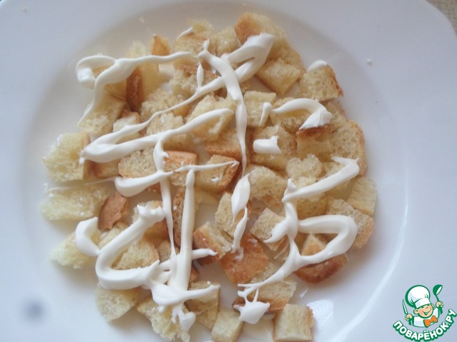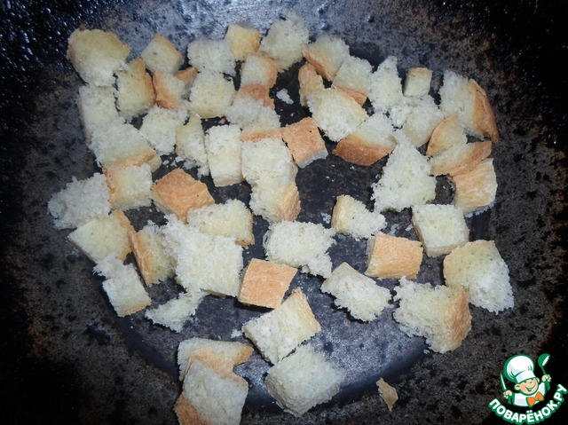 Хлеб режем кубиками, подсушиваем на сухой сковороде. |