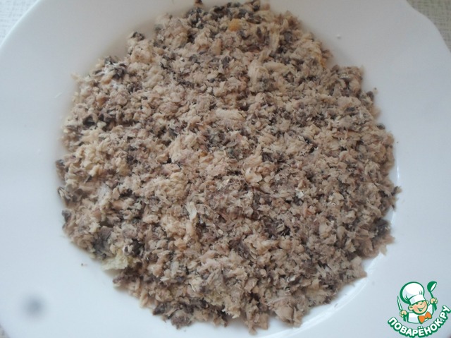 Следом выкладываем слой рыбы (с сардин слить сок и раскрошить их вилкой). |