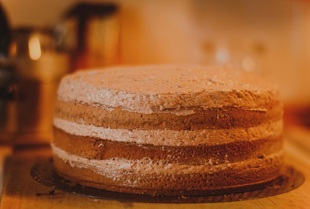 5. Вынуть корж из духовки, провести ножом вокруг, чтобы отделить его от формы (хотя он должен отделиться сам :D). Изъять из формы, остудить и разрезать на 3 ровных коржа.