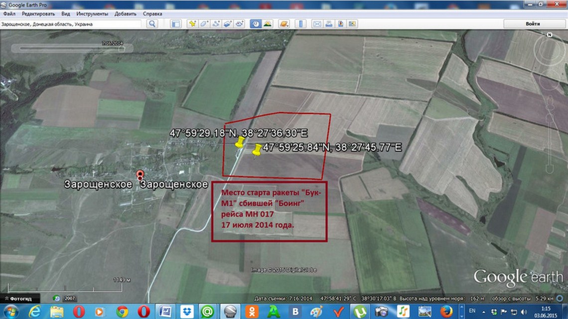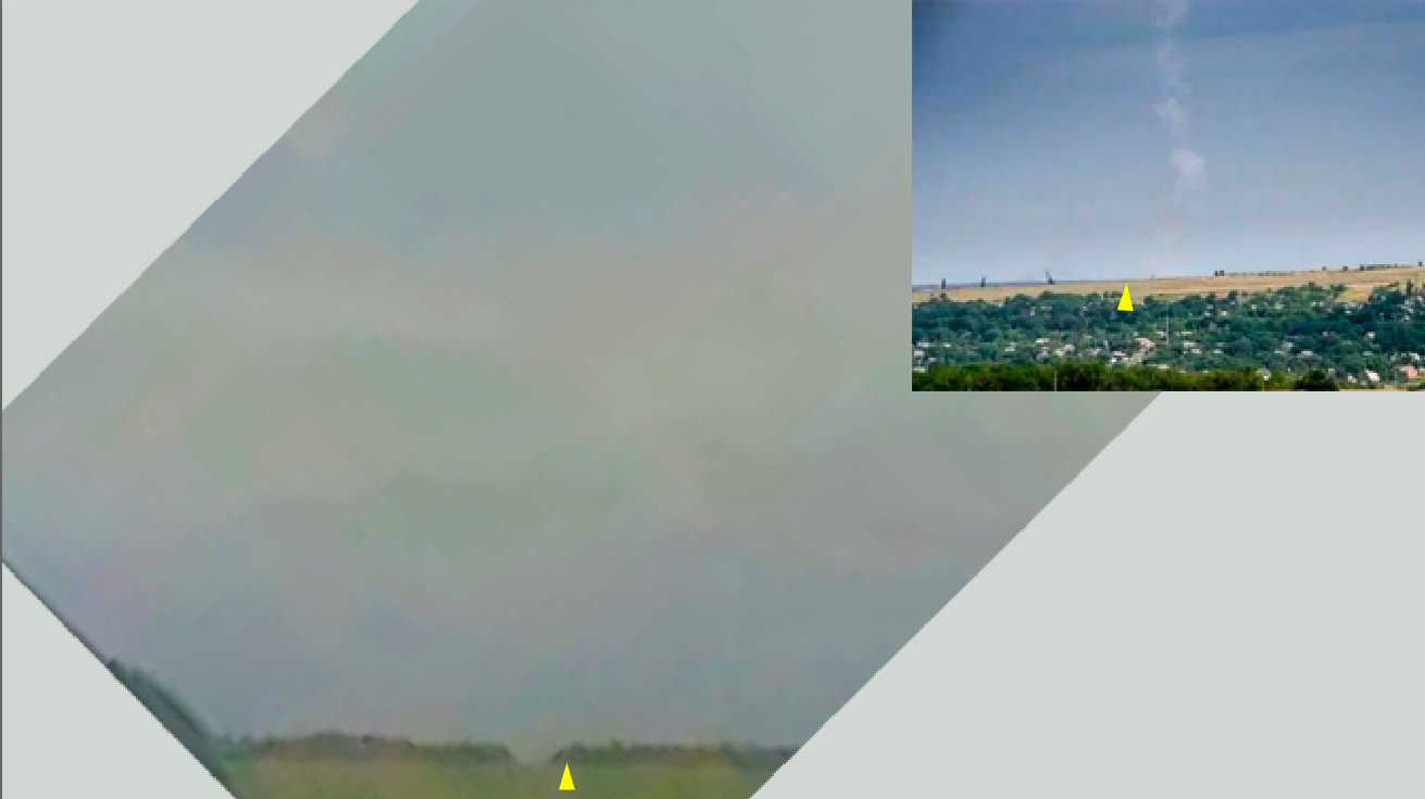 Жёлтая линия на карте соединяет точку съёмки и утверждаемую следствием точку пуска. Как видим, облачность абсолютно одинаковая и нет никаких разрывов. Единственное объяснение, кто-то правил метаданные на предмет изменения данных для первых двух снимков со следом, и в третьем с дымом. А эти снимки были главным козырем в обвинении причастности России, что пуск был произведён с территории, подконтрольной ополчению. Ну, и заключительный штрих. Уже не помню источник, остался только скрин