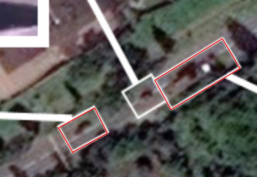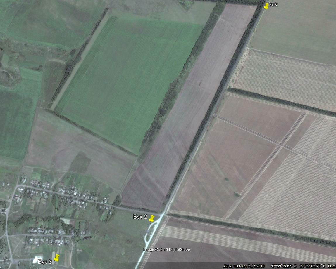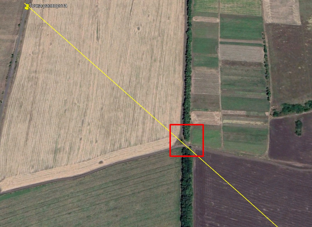За 16-е видна на краю поля СОУ, за 20-е СОУ уже нет, виден прогар от пуска. Можно возразить, что это куст, который виден на снимке за 16-е, но если бы куст остался, то был бы след его объезда комбайном, а так, это куст сорняка, который комбайн просто снёс, не глядя. Да и форма не соответствует кусту, плюс - в широкой части цвет радикально чёрный, что соответствует обугливанию. С очень высокой вероятностью это след пуска. Координаты: 48° 0'9.90"С 38°27'47.72"В. Кроме того, там батарея была, которая видна на снимке за 16-е, и пропала со снимка за 20-е.