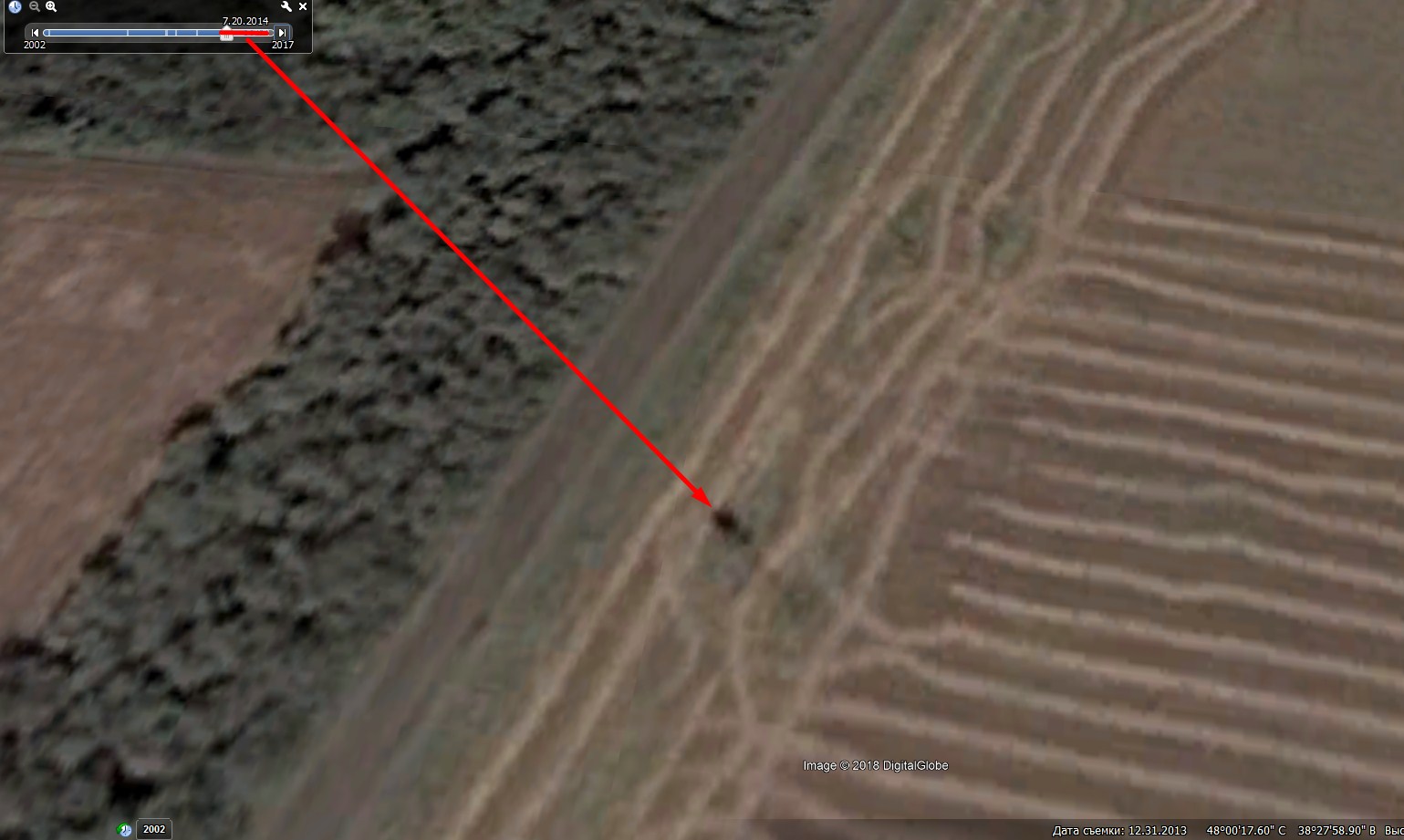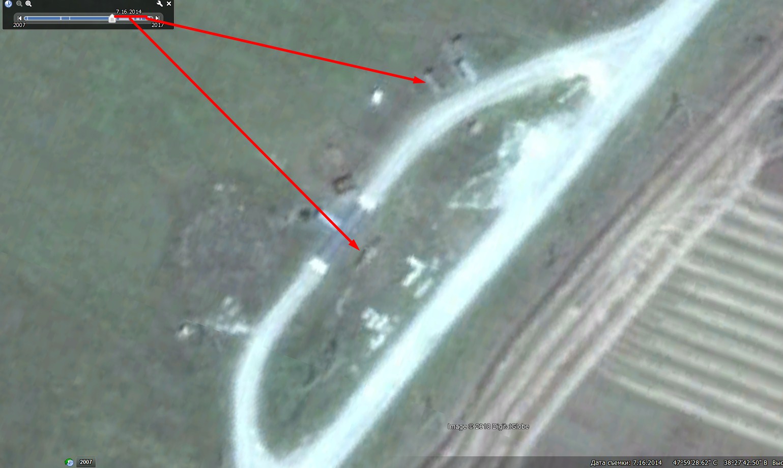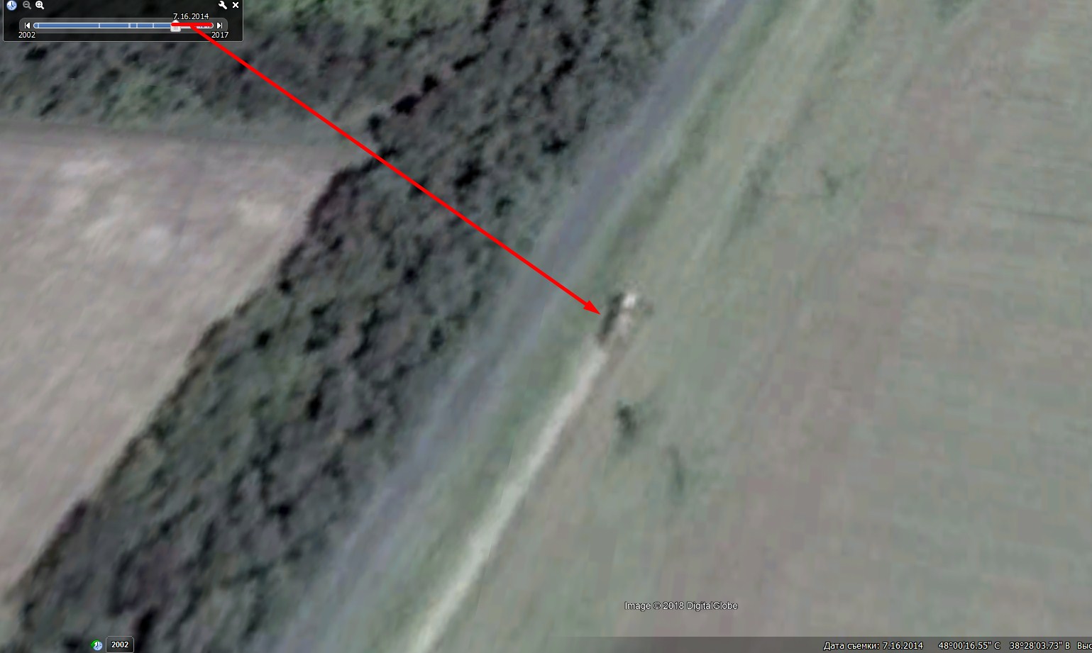 С момента 12:18. Космический снимок как бы должен был подтвердить провоз СОУ в Макеевке. Не подтвердил. Прошу обратить внимание на стиль - подтверждение через другой источник. Этот стиль будет наблюдаться и в другом случае. Народ тогда обратил внимание, что за день до того по тому маршруту прошла гусеничная техника, в том же направлении, что и видеорегистратор, которая оставила заметные следы на асфальте, которых нет в видеозаписи. Видео проезда техники около заправки имелось на тюбике, хорошо видны следы. Из чего народ сделал вывод, что видео для монтажа было снято в другой день, ещё до прохода техники. Для чего фейкометчикам и потребовалась попытка доказательства через спутниковый снимок. Точно такой же трюк предпринимался и со снимками Алейникова.