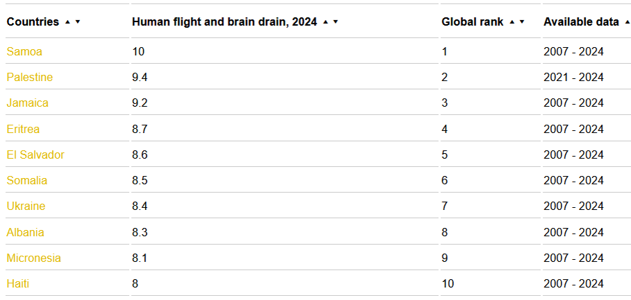 Рейтинг стран, из которых идет самый большой отток квалифицированных граждан, опубликовал ресурс "The Global Economy".