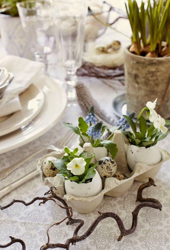 Если за праздничным столом слишком много яств и для объёмных украшений места остаётся совсем мало, то использование миниатюрных цветочных композиций станет довольно привлекательным вариантом. Попробуйте поместить свежие лесные цветочки в яичную скорлупу, ведь таких вылупившихся «цыплят» точно никто не ожидает увидеть.