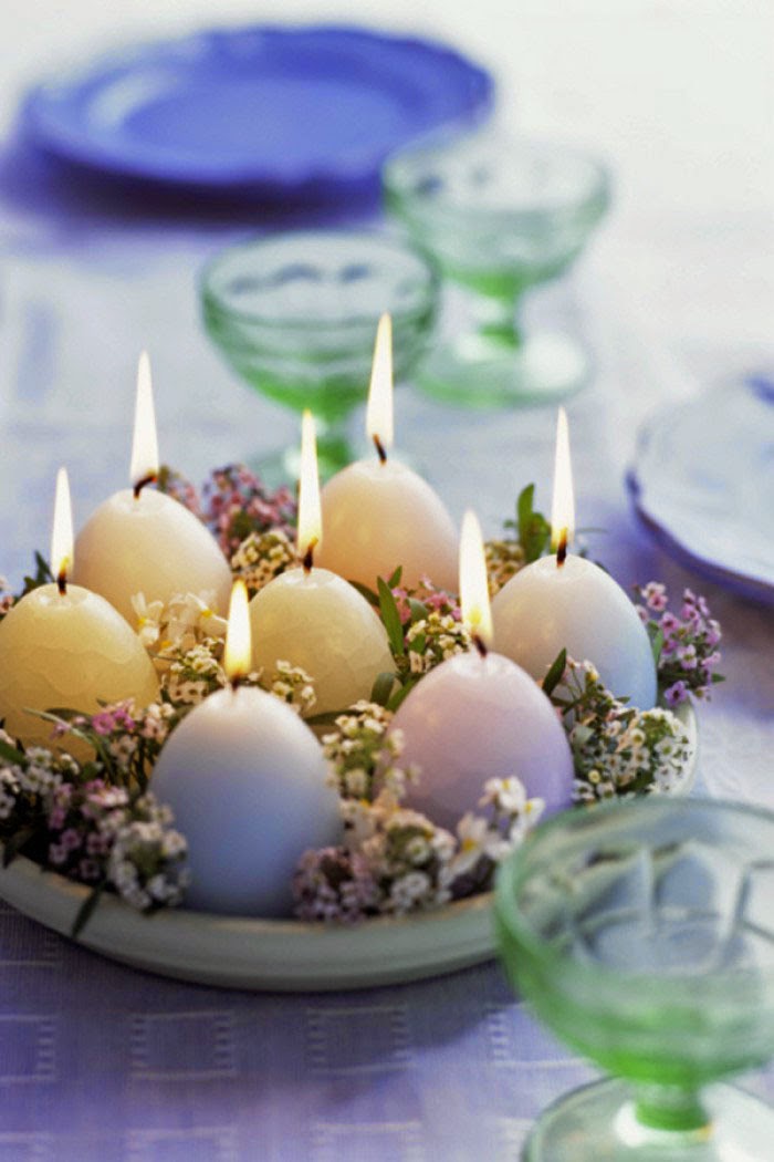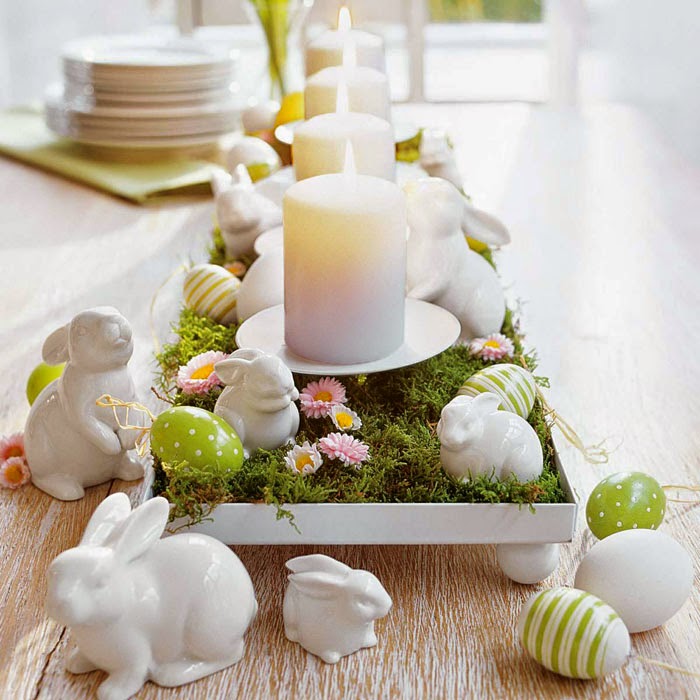 Чаще всего центральное место за пасхальным столом традиционно отводится куличу или окрашенным яйцам, но если в этом году вам хочется чего-то более оригинального — создайте целую композицию в виде импровизированной лужайки из мха и прыгающего вокруг неё целого семейства фарфоровых кроликов. Дополнить всё это волшебство можно свечами и, конечно же, главными героями — пасхальными яйцами.