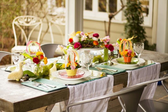 Нарциссы уверенно ассоциируются с весной, а яркий жёлтый цвет смотрится очень свежо и жизнерадостно. И даже если у вас нет огромных горшков с цветущими нарциссами, просто положите каждому гостю на салфеточку небольшие жёлтые цветочки, и они прекрасно освежат обстановку, особенно если разместить их на фоне нежно-голубых тарелок.