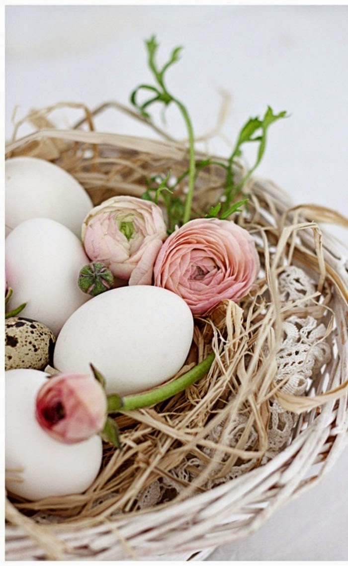 Украшение стола яичками в гнезде создаст потрясающую весеннюю атмосферу в светлый праздник Пасхи. Просто обзаведитесь парочкой перепелиных яиц, а гнёздышко можно свить из тонких веточек, сушёной травы или даже из тонко нарезанной бумаги. Кстати, веточка вербы станет прекрасным дополнением к такой красоте.