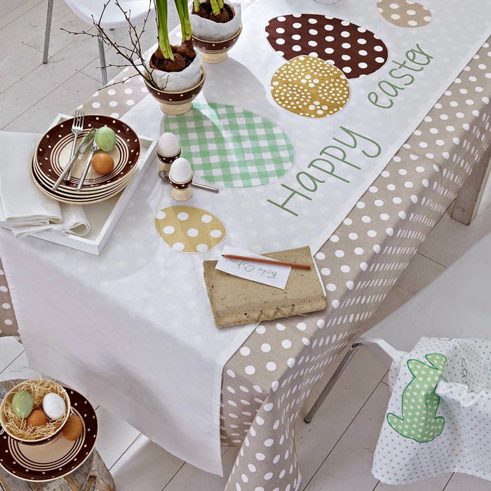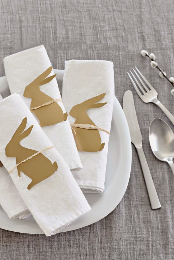 Выбирая салфетки для сервировки, остановите свой выбор на льняных вариантах белого цвета. А праздничную атмосферу привнесут фигурки кроликов и цыплят, которые можно вырезать из крафт-бумаги.