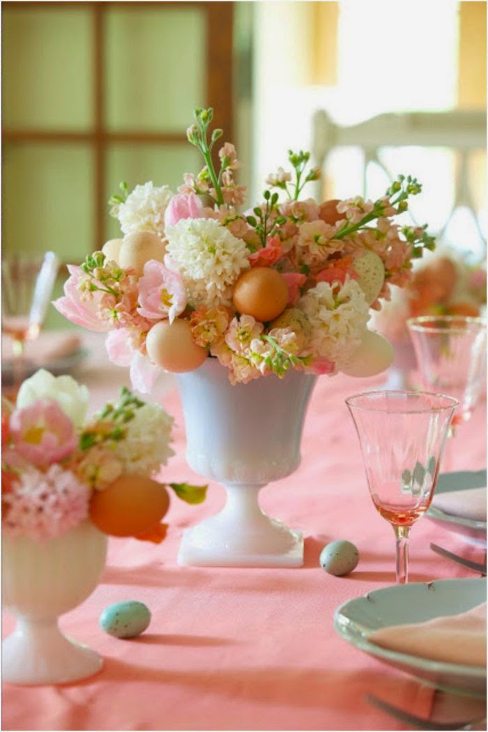 Довольно оригинальный способ задекорировать стол — взять широкую вазу из прозрачного стекла и в неё поместить ещё одну вазу с цветами, но поменьше. А свободное пространство заполнить крашеными яйцами. Такой букет уж точно не останется незамеченным.