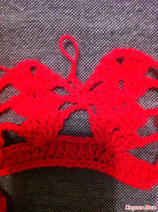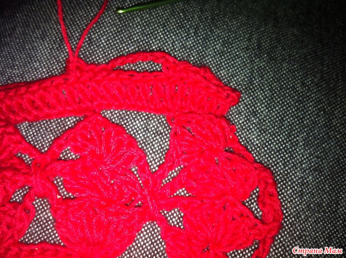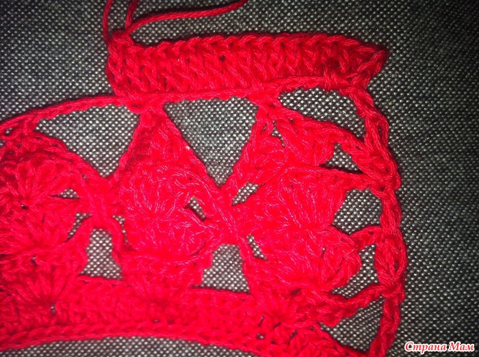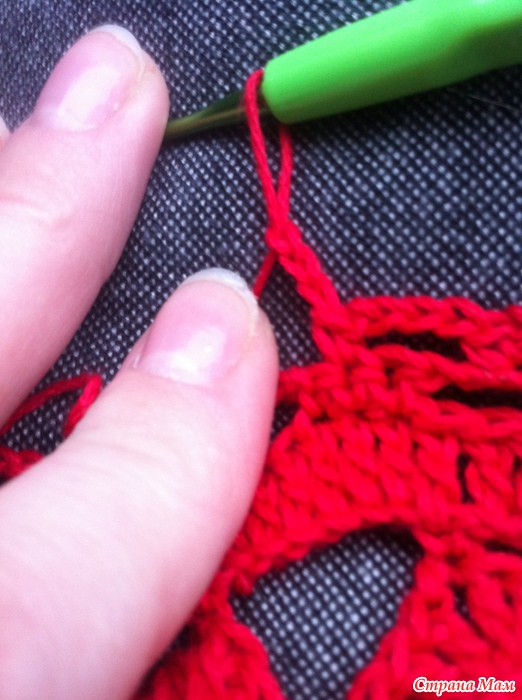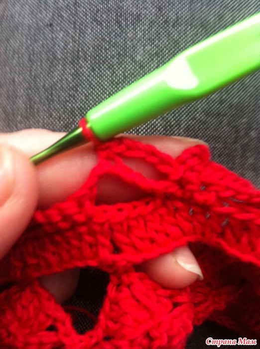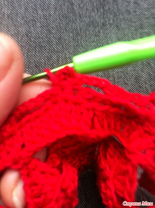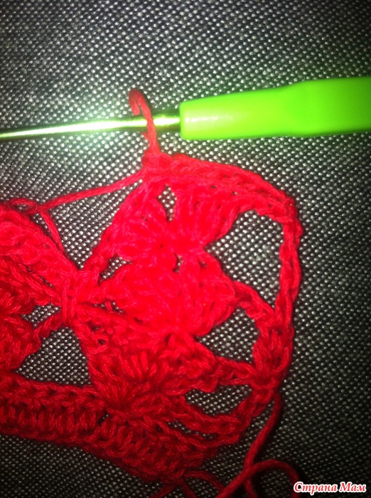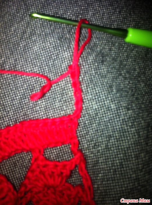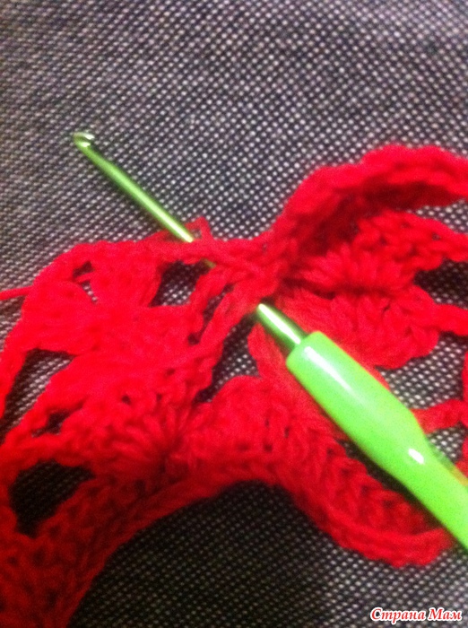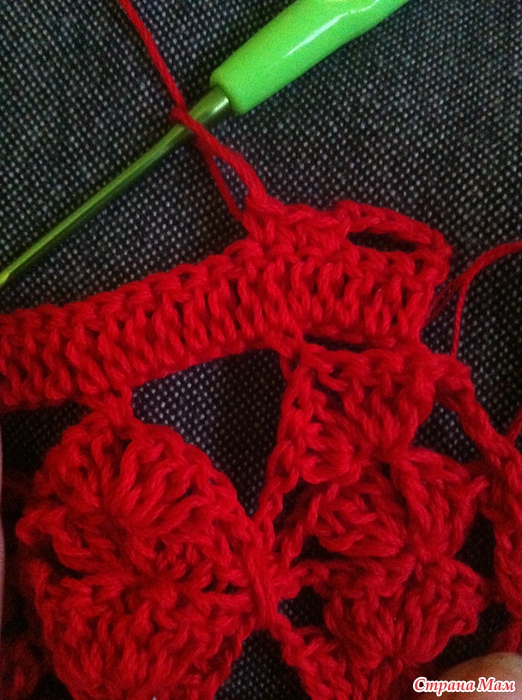 Для нового ряда делаем 7 вп подъема, провязываем ст бн в вп предыдущего ряда, 6 вп, ст бн в вп предыдущего ряда и т. д. Заканчиваем ряд столбиком с 2 накидами.