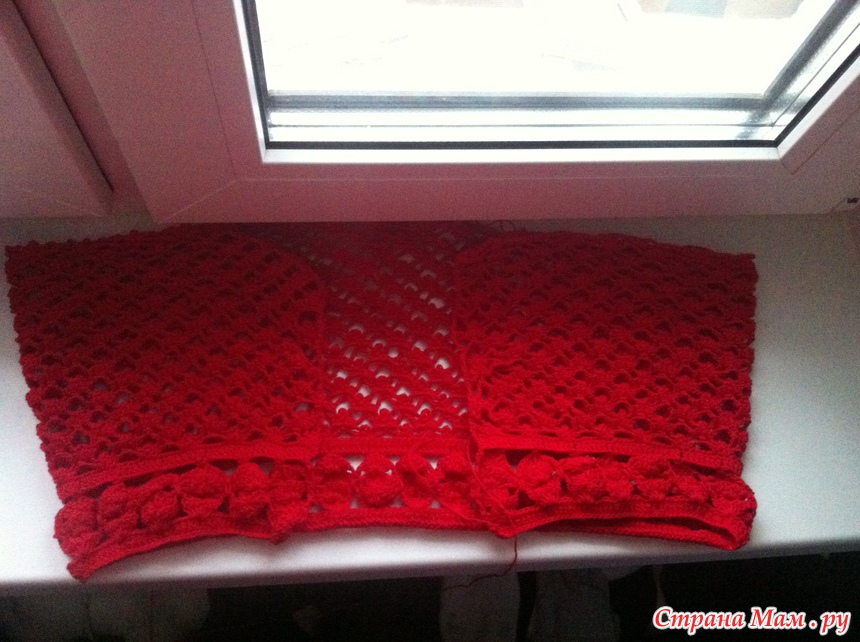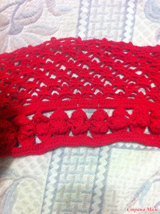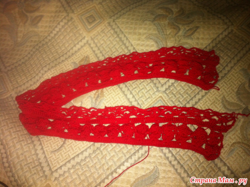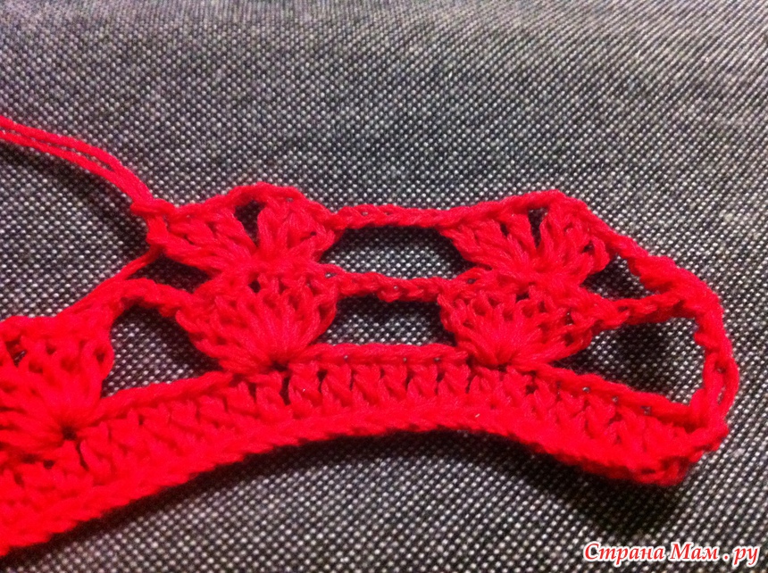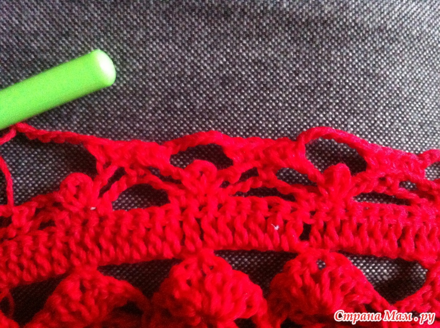 Далее 2 вп, 2 ст сн в воздушную петлю предыдущего ряда, 2 вп, 3 ст сн, 5 вп и т. д. до конца ряда.