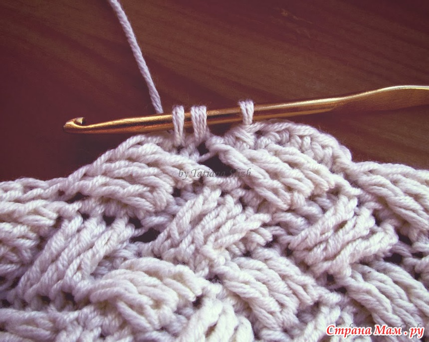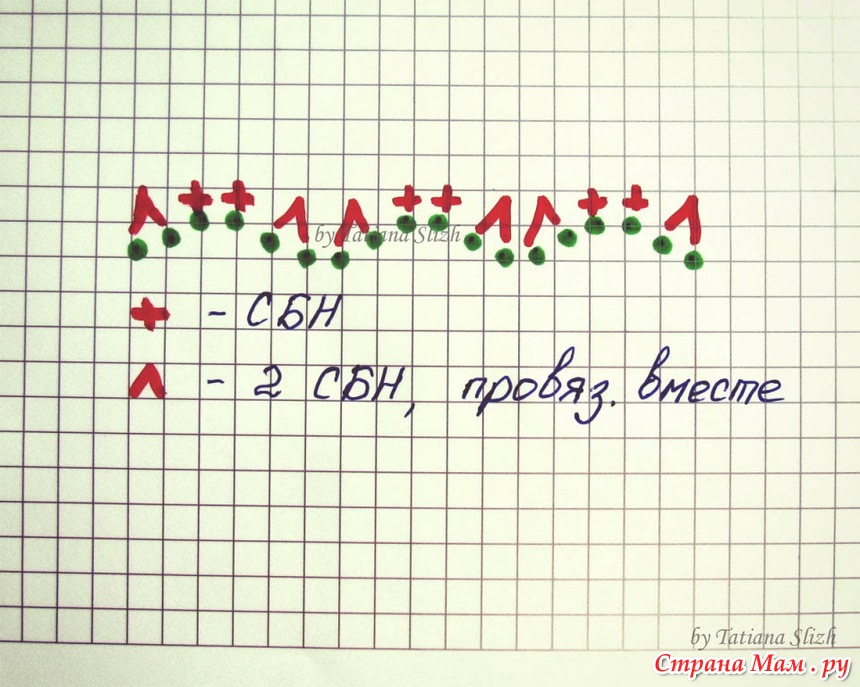 2 ряд: *4 ВП подъема, 2 СС2Н в 1-ый СБН пред. ряда, 3 СС2Н в послед. СБН пред. ряда (ВАЖНО! крючок в СБН вводим за уже провязанными ВП подъема и 2-мя СС2Н), пропускаем 1 СБН пред. ряда, повтяряем от *, заменяя ВП подъема на 1 СС2Н.