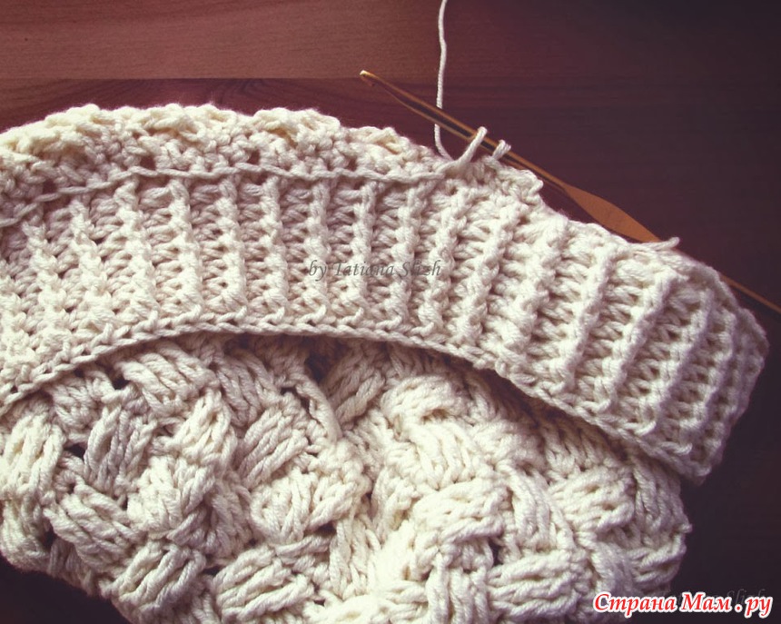 Выворачиваем шапку наизнанку, отгибаем резинку. Хорошо видно задние полупетли выравнивающего край ряда СБН. За них и будем цепляться. Закрепляем нить и провязываем 96 СБН.
