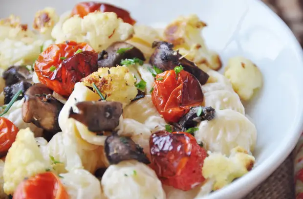 3. Варить пенне до состояния аль денте, затем смешать макароны с цветной капустой, помидорами, сливками, чесноком, тимьяном, красным перцем, 2 стаканами фонтина и 0,8 стакана пармезана. Приправить все солью и перцем, переложить в смазанную маслом форму для запекания. Посыпать сверху остатками сыра обоих видов и поместить в духовку на 15 минут.