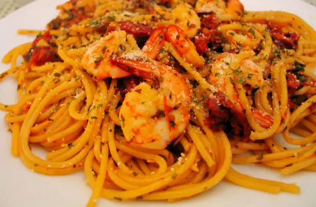3. Приготовить пасту и слить воду, оставив лишь чашку воды. Перемешать в кастрюле макароны с томатной пастой, креветками, петрушкой и водой от пасты. Полить все 1 ст.л. оливкового масла, приправить солью и перцем при необходимости и сразу подавать.
