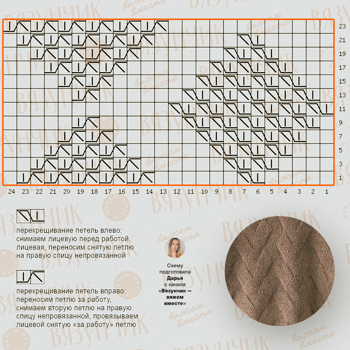 Раппорт узора — 24 петли и 24 ряда. 1 жгут в шахматном порядке (половина раппорта) — 12 петель и 24 ряда.