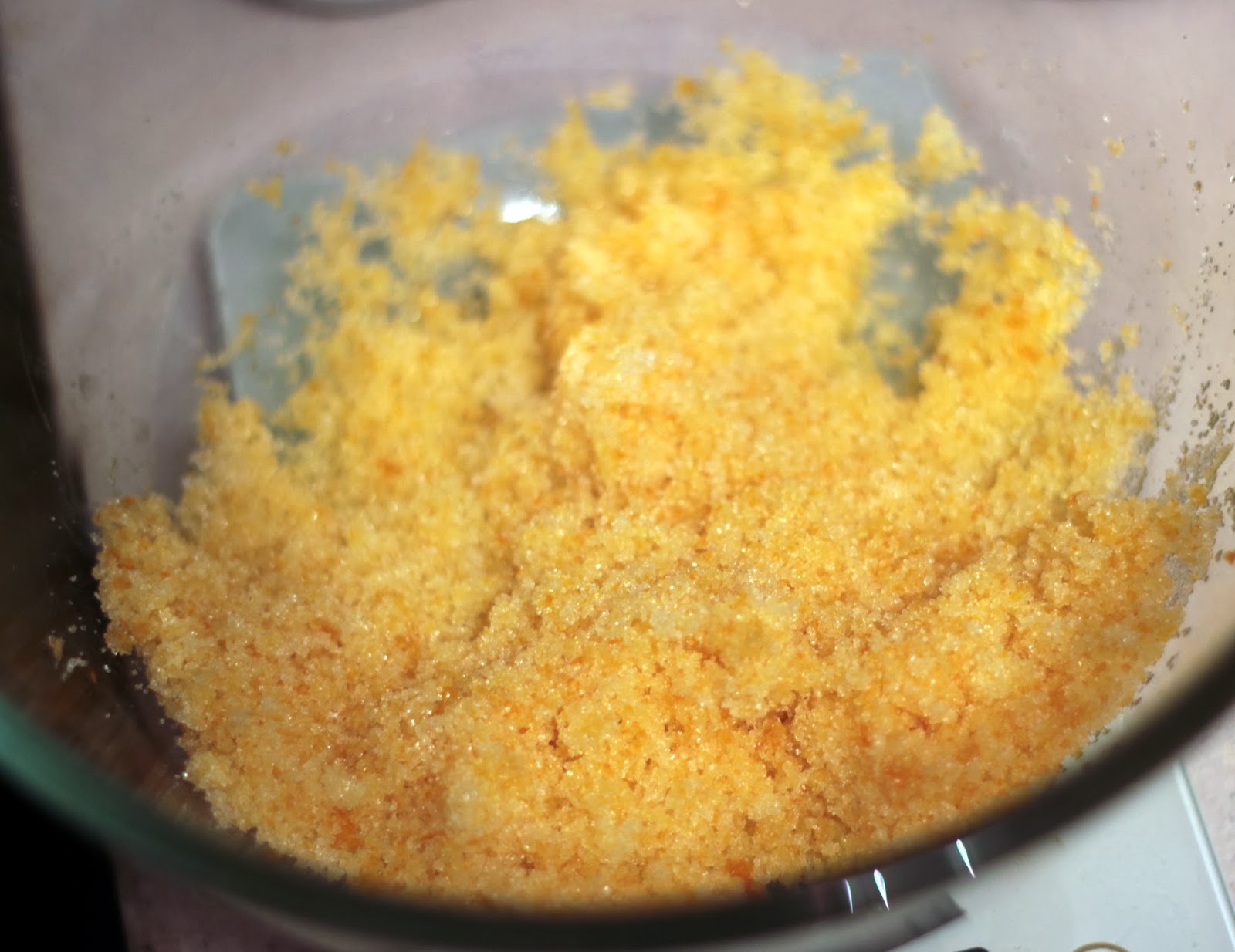 4. Приготовить заварной апельсиновый крем. Растереть пальцами сахар с апельсиновой цедрой.