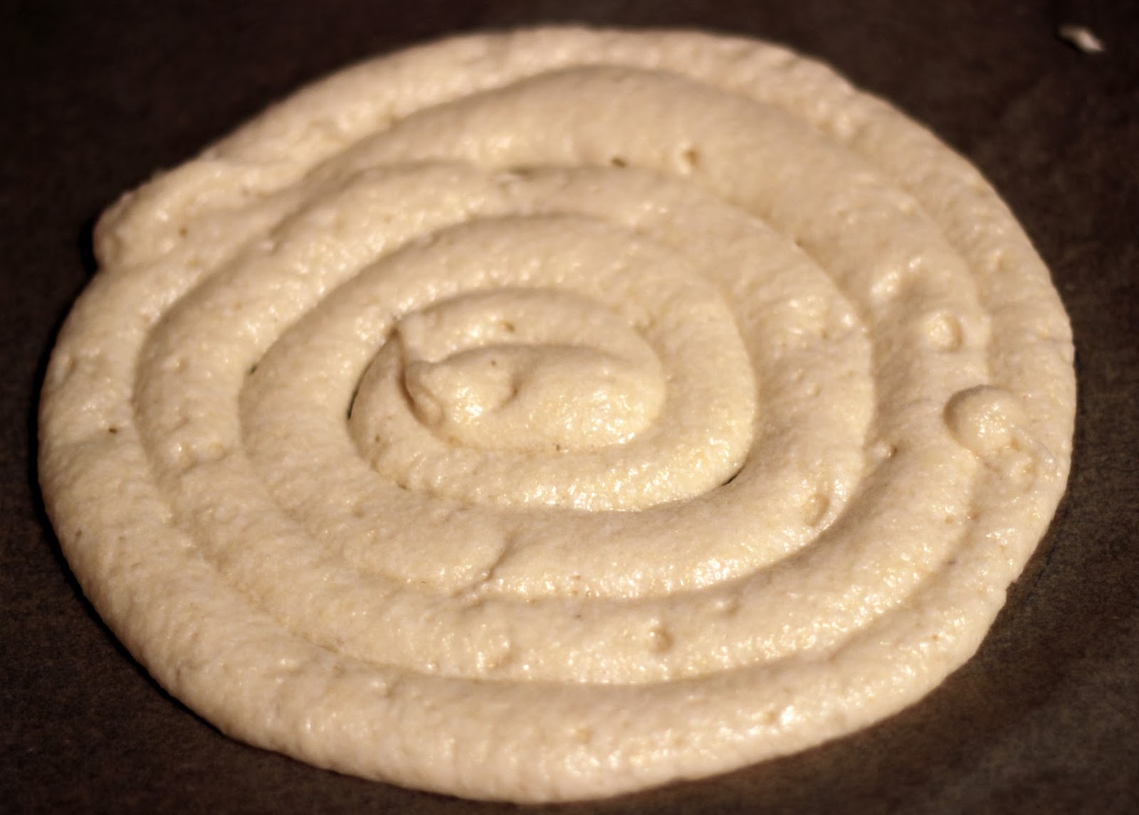 Сложить тесто в кондитерский мешок с прямой насадкой (или просто отрезать уголок) и выложить тесто на бумагу для выпечки по спирали в виде диска диаметром, равным диаметру будущего торта. Количества ингредиентов, которое я привела, хватает на диск диаметром 20 см. Я и испекла такой диск, но потом решила делать торт в форме повыше, которая у меня 18 см в диаметре, и обрезала бисквит до нужного размера. Думаю, не стоит уменьшать количество ингредиентов, пусть лучше будет какой-то запас.