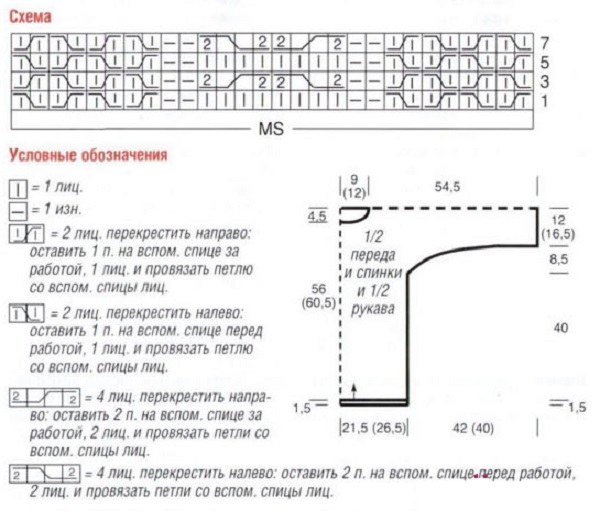 Основной узор: число петель кратно 28 + 2 кром. Вязать по схеме, на которой приведены только лиц. р., в изн. р. петли вязать по рисунку. Повторять между кром. раппорт и с 1-го по 8-й р.