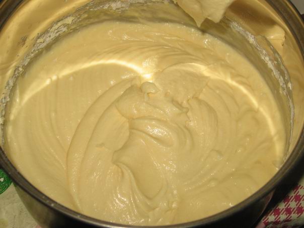 Потом сметану и разрыхлитель, муку. Всё тщательно перемешиваем.
