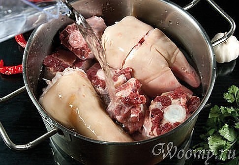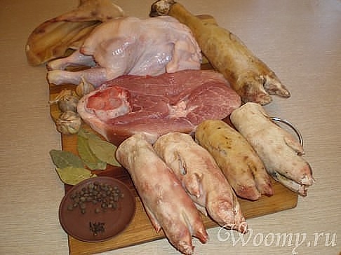 Свиные ножки, которые являются залогом застывания блюда, необходимо