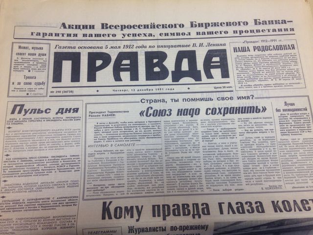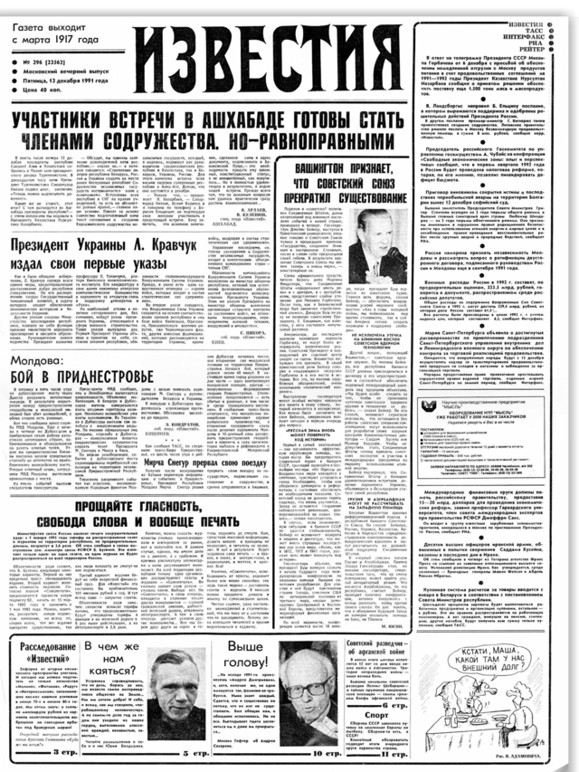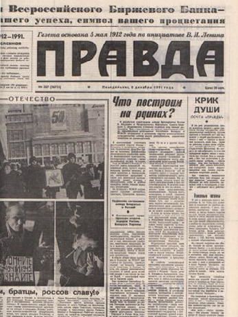 Советская пресса не сразу отозвалась на подписание Беловежских соглашений 8 декабря, но в следующие дни это событие не сходило с передовиц газет.
