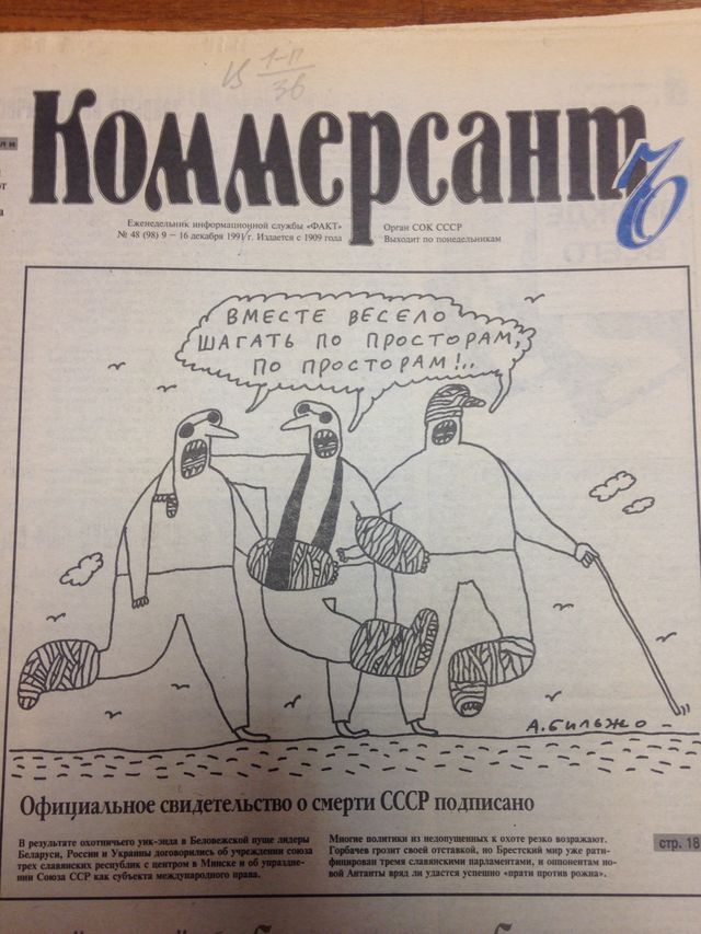 На следующий день после подписания Беловежских соглашений газета "Коммерсант" вышла с карикатурой на первой полосе: Кравчук, Шушкевич и Ельцин "шагают по просторам".