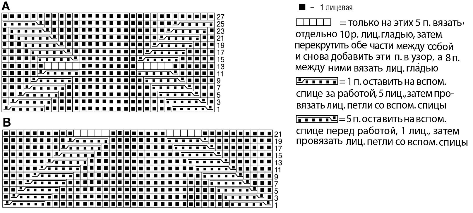 Через 4 см = 9 р. от наборного края вязать на средних 38 п. узор с ромбами B и на оставшихся петлях с обеих сторон – лиц. гладью.