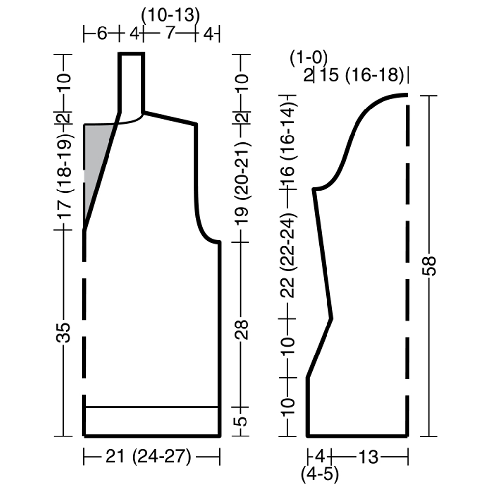 Через 10 см = 23 р. от наборного края закрыть для сужения с обеих сторон 1 x 1 п. и в каждом 4-м р. 6 x 1 п. (в каждом 4-м р. 6 x 1 п. - в каждом 2-м р. 2 x 1 п. и в каждом 4-м р. 5 x 1 п.) = 46 (46-48) п. Затем прибавить для скосов с обеих сторон в след. 14-м р. 1 x 1 п. и в каждом 12-м р. 2 x 1 п. (в след. 10-м р. 1 x 1 п. и в каждом 8-м р. 4 x 1 п. - в след. 8-м р. 1 x 1 п. и в каждом 6-м р. 7x 1 п.) = 52 (56-64) п.