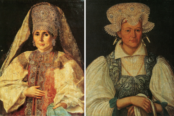 А. Клюквин. «Женщина в кокошнике Псковской губернии. Начало XIX века» и работа неизвестного художника «Женщина в русском костюме XVIII в.»
