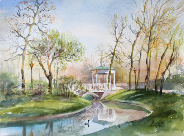 Сад Музея-усадьбы Г. Р. Державина. Акварель Елены Заяц