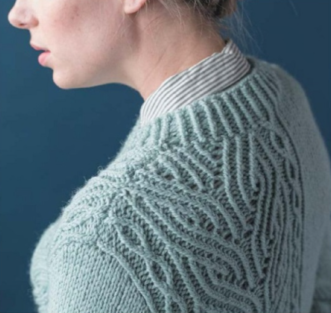 Перед и спинка до подмышек вяжется круговыми рядами, затем перед и спинка вяжутся поворотными рядами. Рукава вяжутся по кругу до оката.