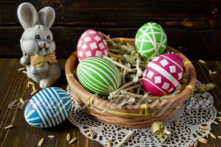 Если у вас найдется немного самоклеящейся плёнки и яркие пищевые краски, то можно раскрасить яйца на Пасху оригинальными полосками и кубиками – просто и красиво, к тому же очень современно.