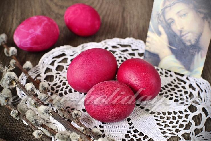 Если есть желание окрасить яйца в красивый бордовый цвет, для этого можно воспользоваться соком из отварной свёклы.