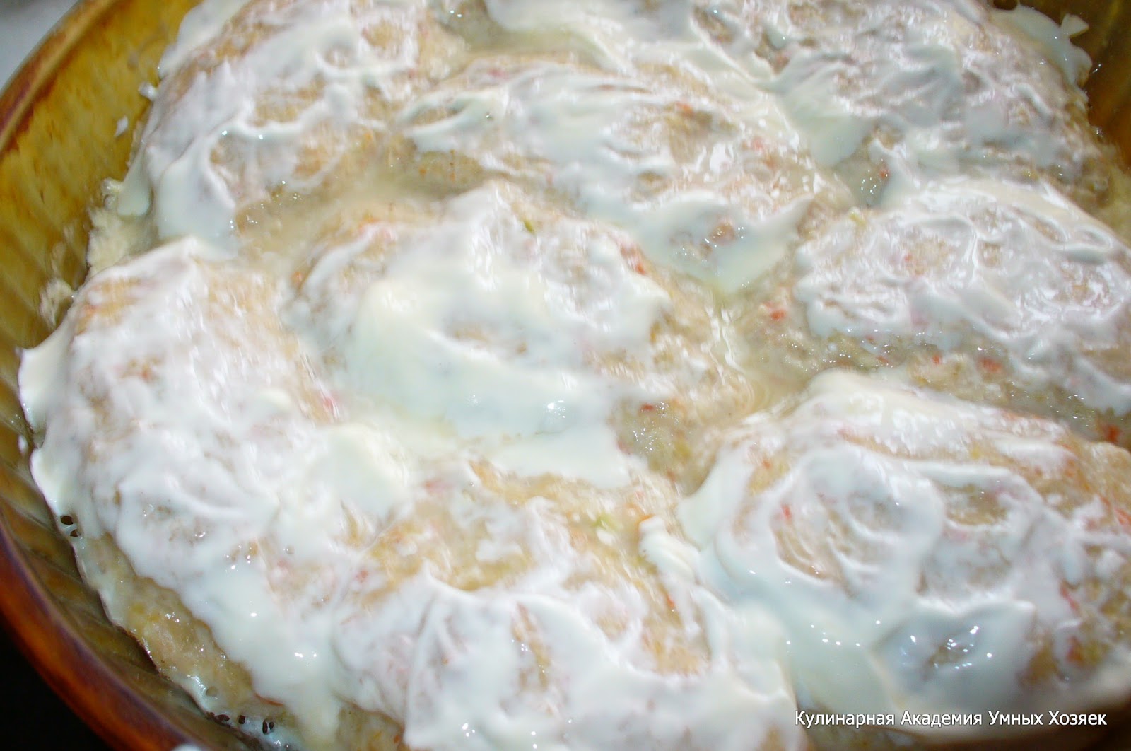 Из полученного фарша влажными руками сформуйте котлеты размером примерно в половину ладони (женскойJ). Уложите котлеты в один ряд в форму для запекания (я использовала стеклянную и ничем ее не смазывала, металлическую форму смажьте на всякий случай растительным маслом, хотя котлеты при запекании дают много сока и ничего не пригорает обычно) и отправьте в духовку.