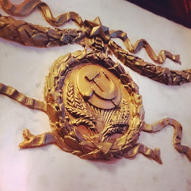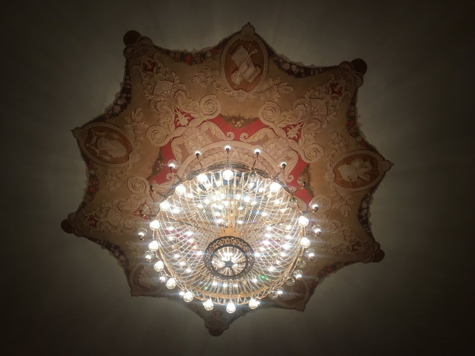 Лепные и живописные детали потолка - тонкая работа студентов Строгановского училища, руководимых художниками А.Дейнеко, Б.Шухминым и Е.Зерновой.