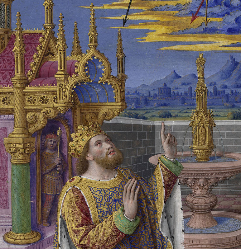 Миниатюра к покаянным псалмам изображает богато одетую даму верхом на козле, в одной руке держащую стрелы — любовные, несомненно, — а в другой — зеркало, на фоне ветхозаветной сцены Давида и Вирсавии — персонификация блуда, одного из семи смертных грехов.