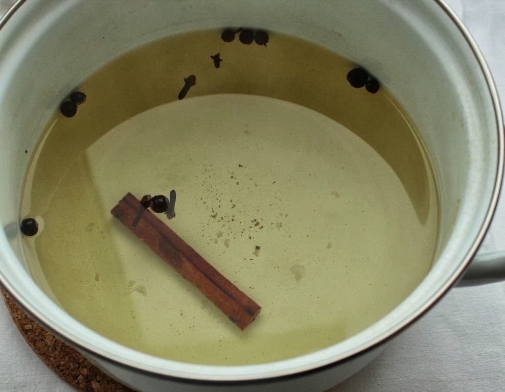 Для маринада вскипятить воду с солью, сахаром и специями. Варить 2-3 минуты.
