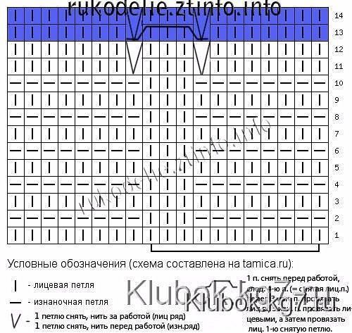 11-й ряд – 7 лиц. п., 1 п. снять не провязывая, нить за работой, 3 лиц. п., 1 п. снять не провязывая, нить за работой, 7 лиц. п.,