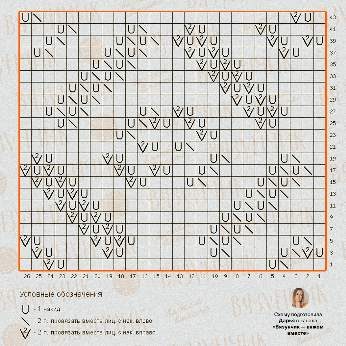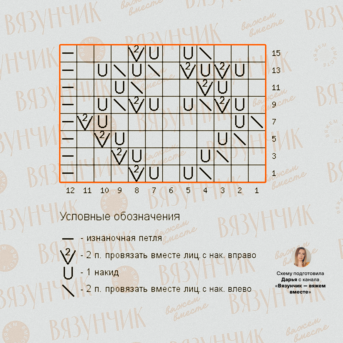 На схеме только лицевые ряды. Изнаночные надо вязать по рисунку. Накиды в изнаночных рядах провязываем изнаночными.