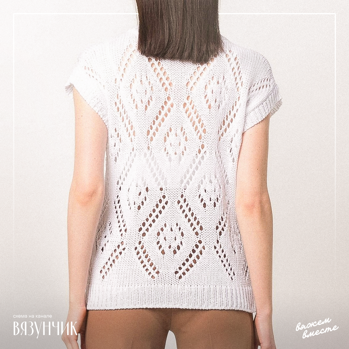 Поскольку отверстия крупные, придется носить безрукавку на хлопковый или любой другой топ, майку. Некоторые читатели остерегаются таких моделей, но если вязать не слишком плотно, правильно выбрать пряжу, полотно будет невесомым и может практически не ощущаться.