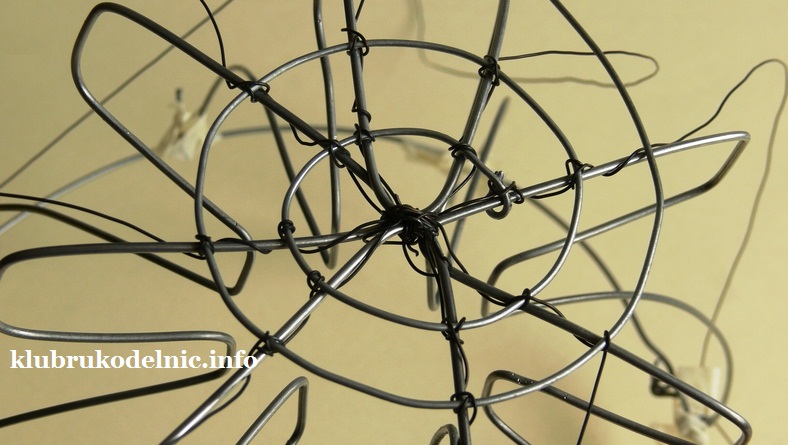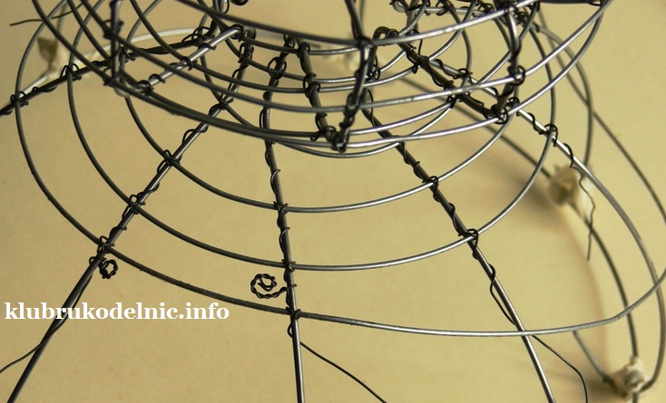 9. Наконец сделаем новый круг для верхнего края из двойной скрученной толстой проволоки. К нему прикрепим ребра при помощи сделанных крючков. Круг закроем декоративной спиралью с крючком на конце.